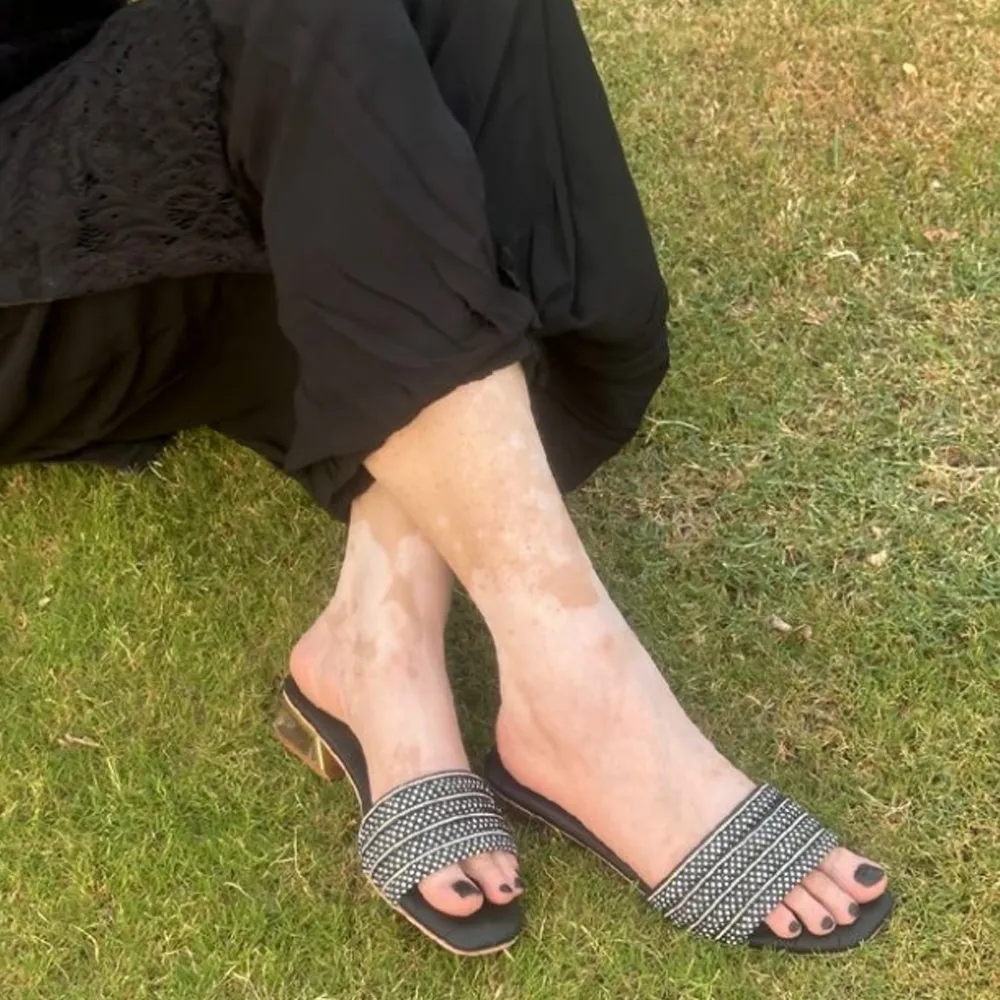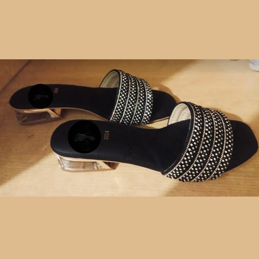 Turn heads with Walk Way’s luxe black slip-ons, designed for statement-making moments. The velvet-textured base pairs flawlessly with crystal-studded straps and a chic transparent block heel for an elevated look. Whether it’s a festive night or a formal gathering, these heels offer glamour with unmatched comfort. A perfect blend of sparkle and sophistication.